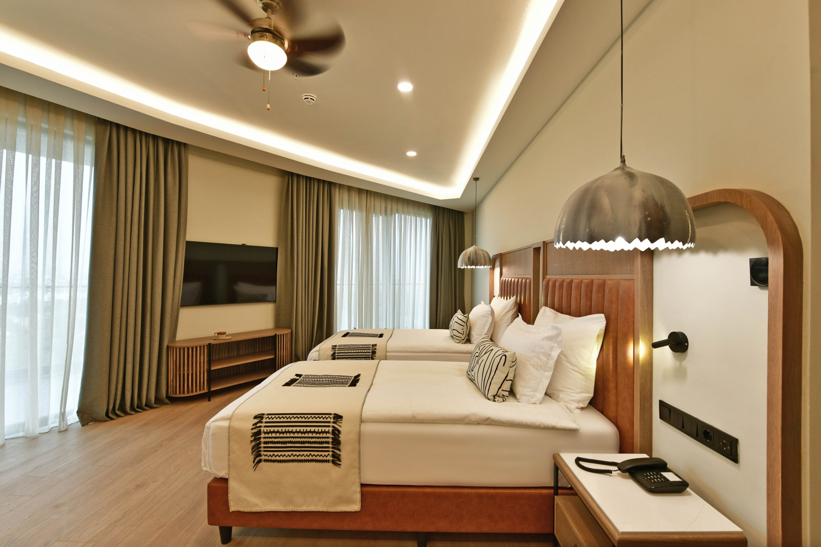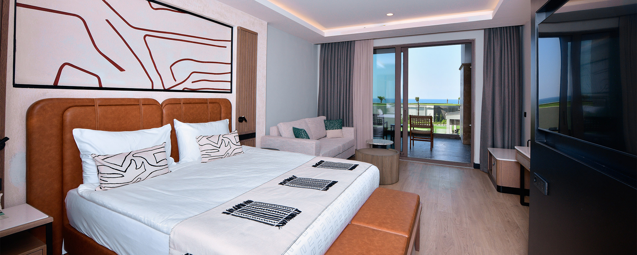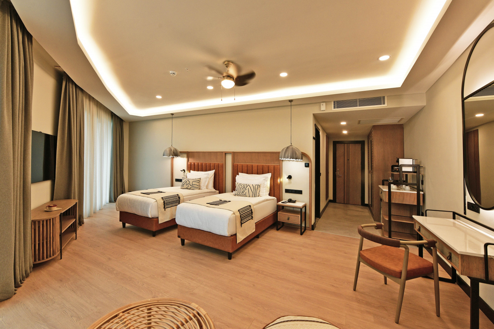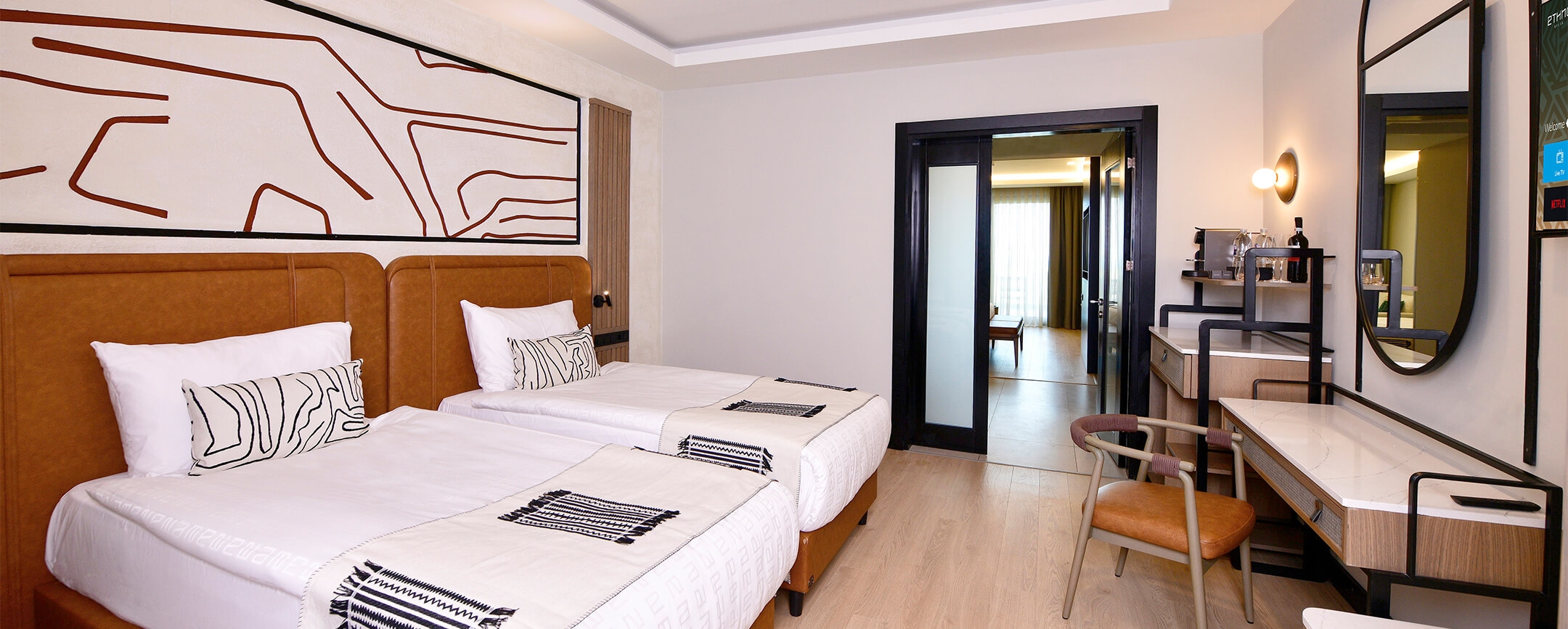 Двухкомнатный номер состоит из двух спальных комнат, разделенных межкомнатной дверью, с одной двуспальной и двумя раздельными кроватями, 2 ванных комнат и балкона. В комплектации телевизор, кондиционер, Wi-Fi, принадлежности для чая/кофе, телефон, мини-бар, сейф, фен, халаты и тапочки.