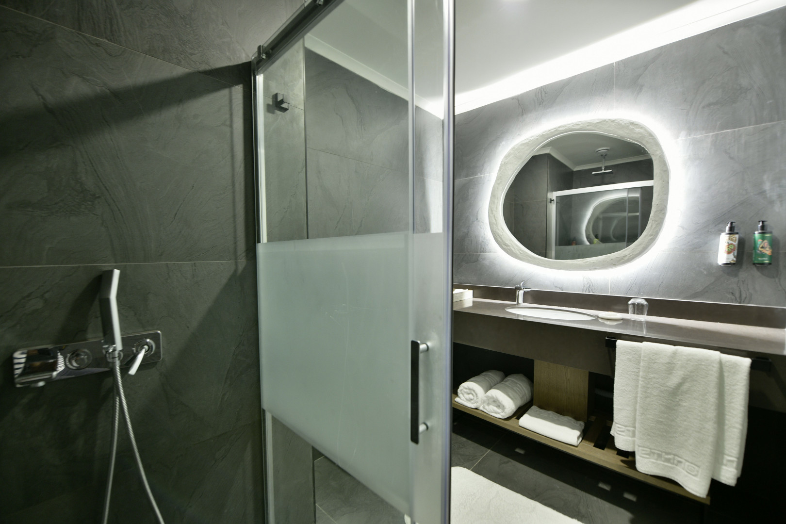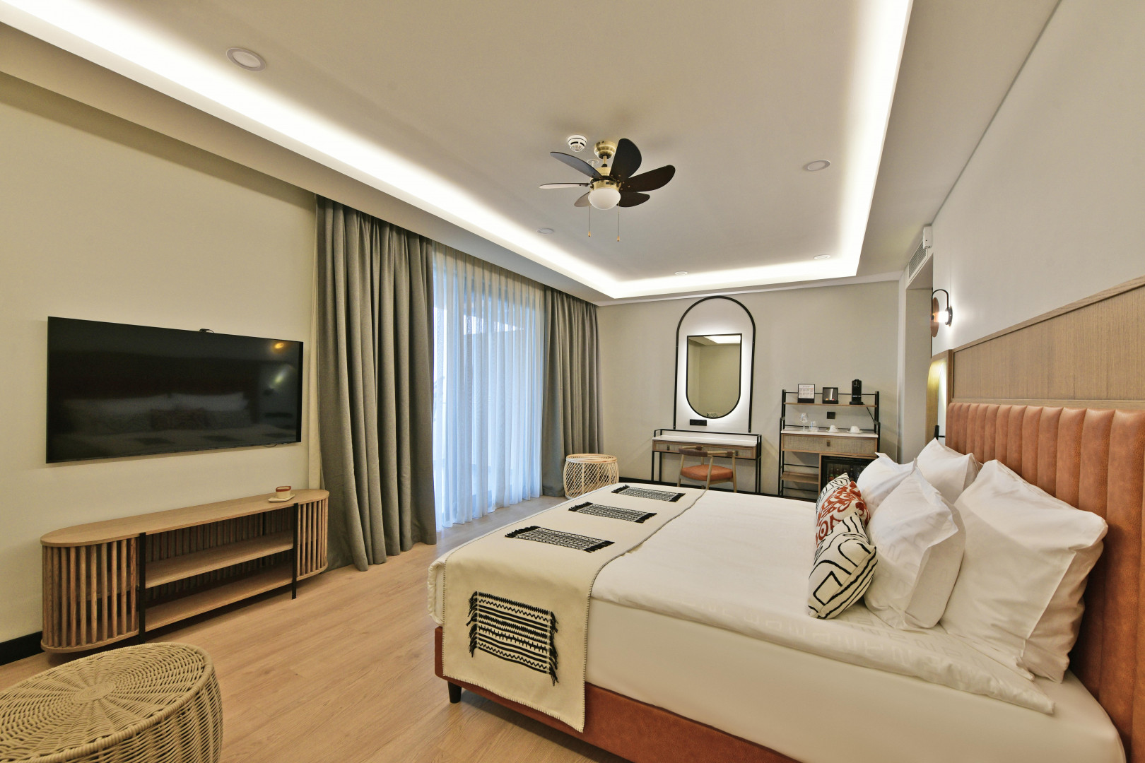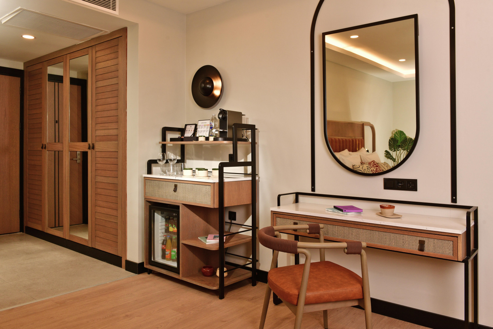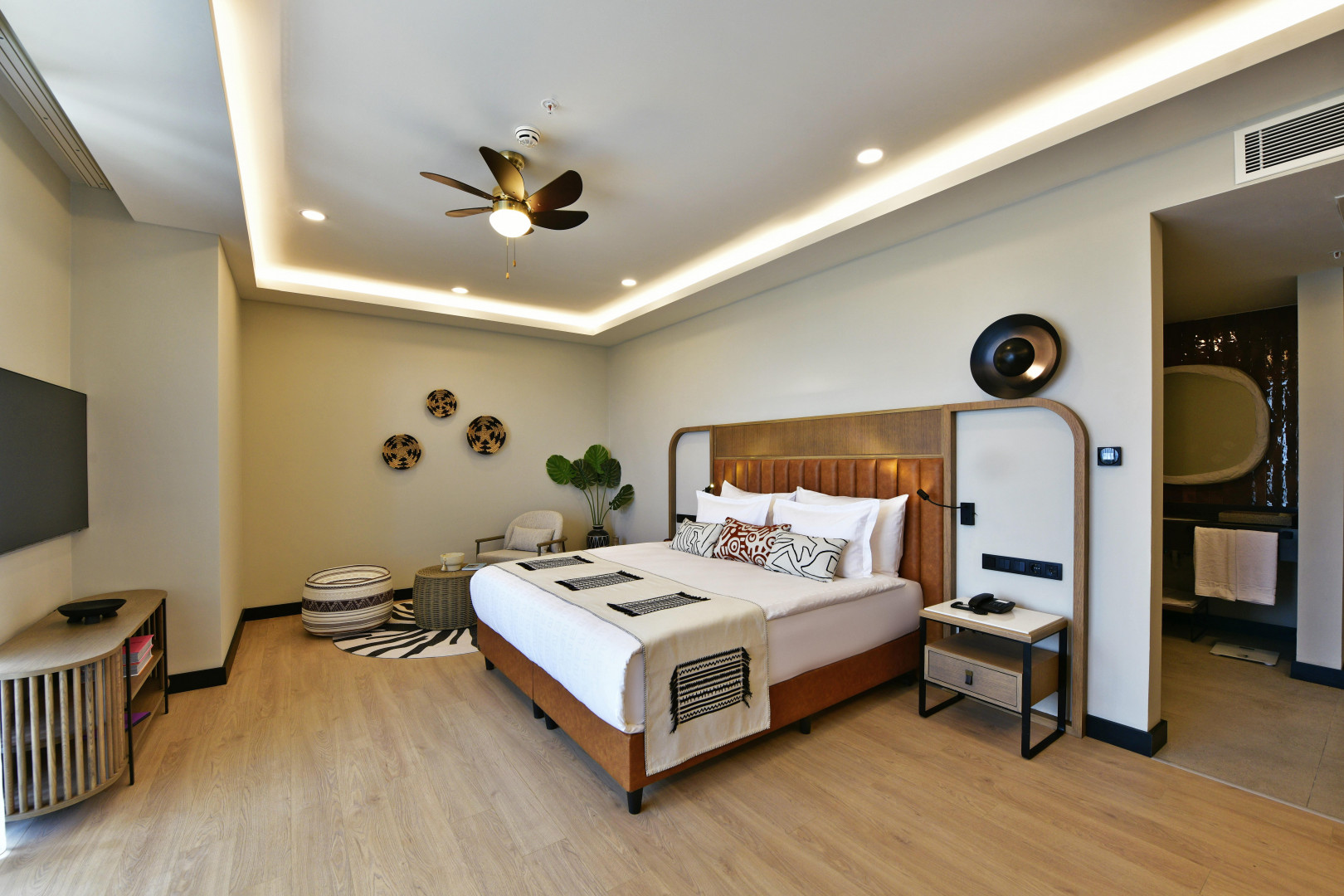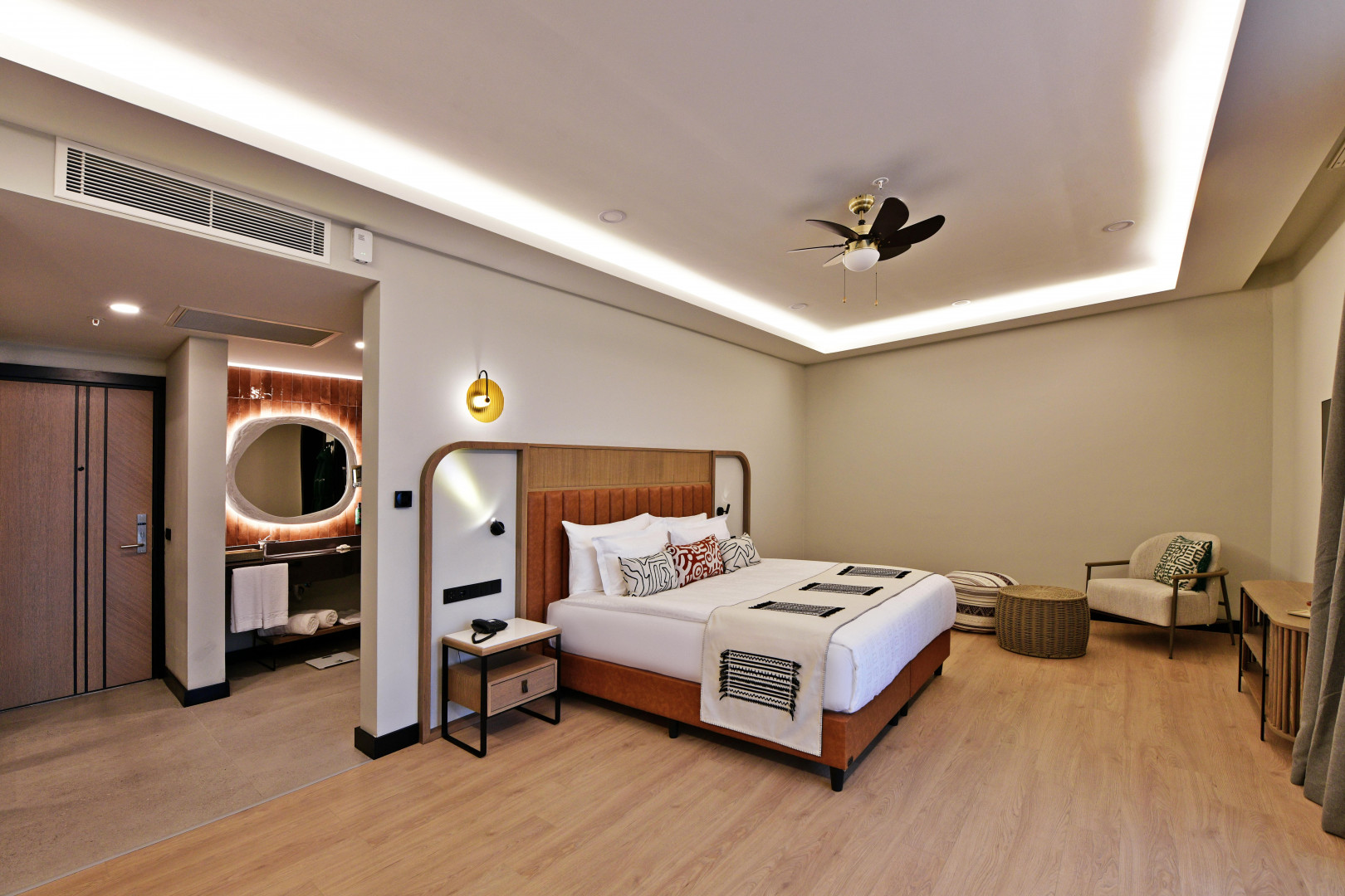 Двухкомнатный номер состоит из двух спальных комнат, разделенных межкомнатной дверью, с одной двуспальной и двумя раздельными кроватями, 2 ванных комнат и балкона. В комплектации телевизор, кондиционер, Wi-Fi, принадлежности для чая/кофе, телефон, мини-бар, сейф, фен, халаты и тапочки.