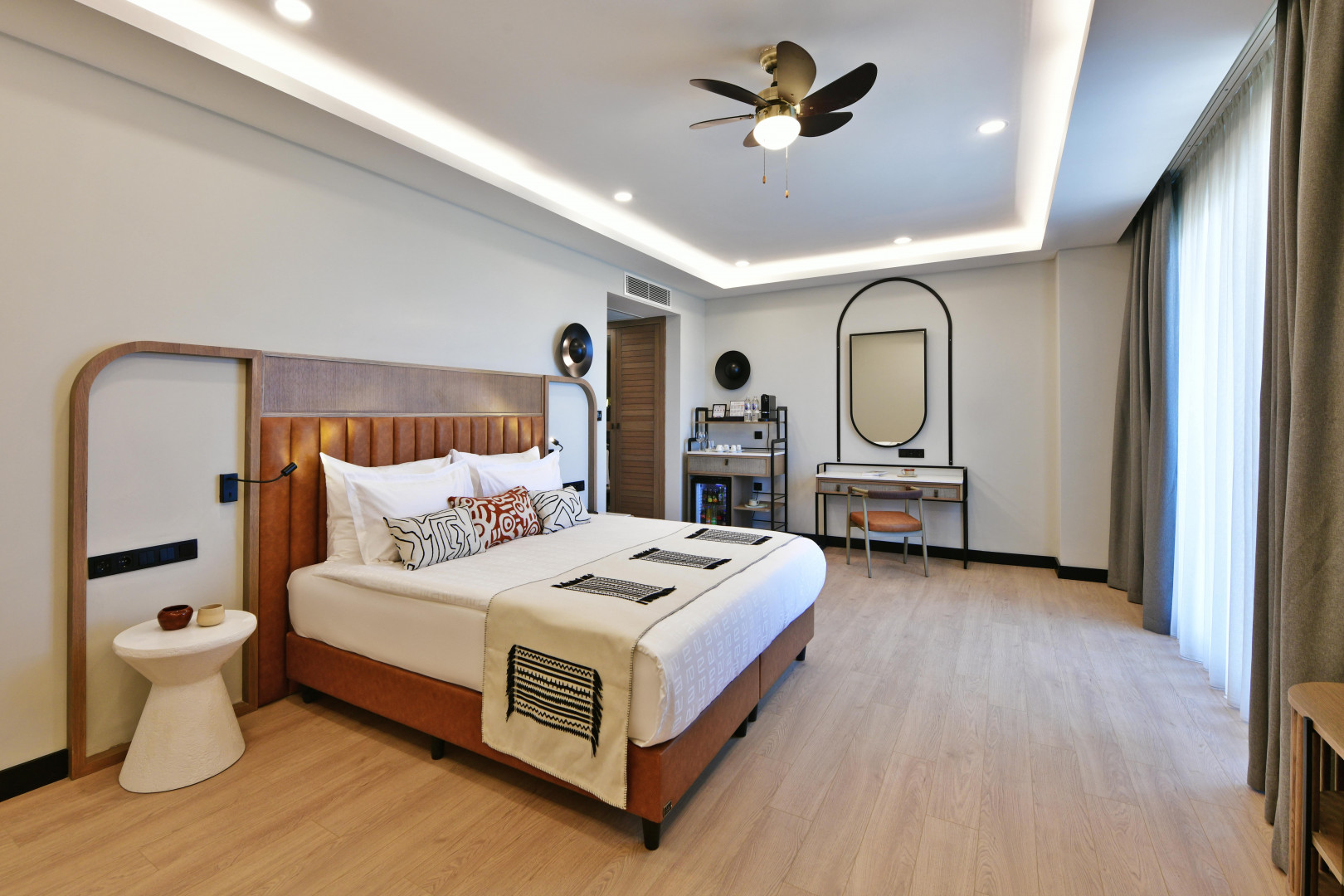 На первом этаже двухэтажного номера расположены гостиная с мини-кухней, диван, ванная комната, терраса с общим бассейном. На втором этаже — 1 спальня с гардеробной, джакузи, ванная комната и отдельный туалет, балкон с уличной мебелью. К услугам гостей кондиционер, 2 телевизора, телефон, мини-бар, сейф, фен, весы, халаты и тапочки.