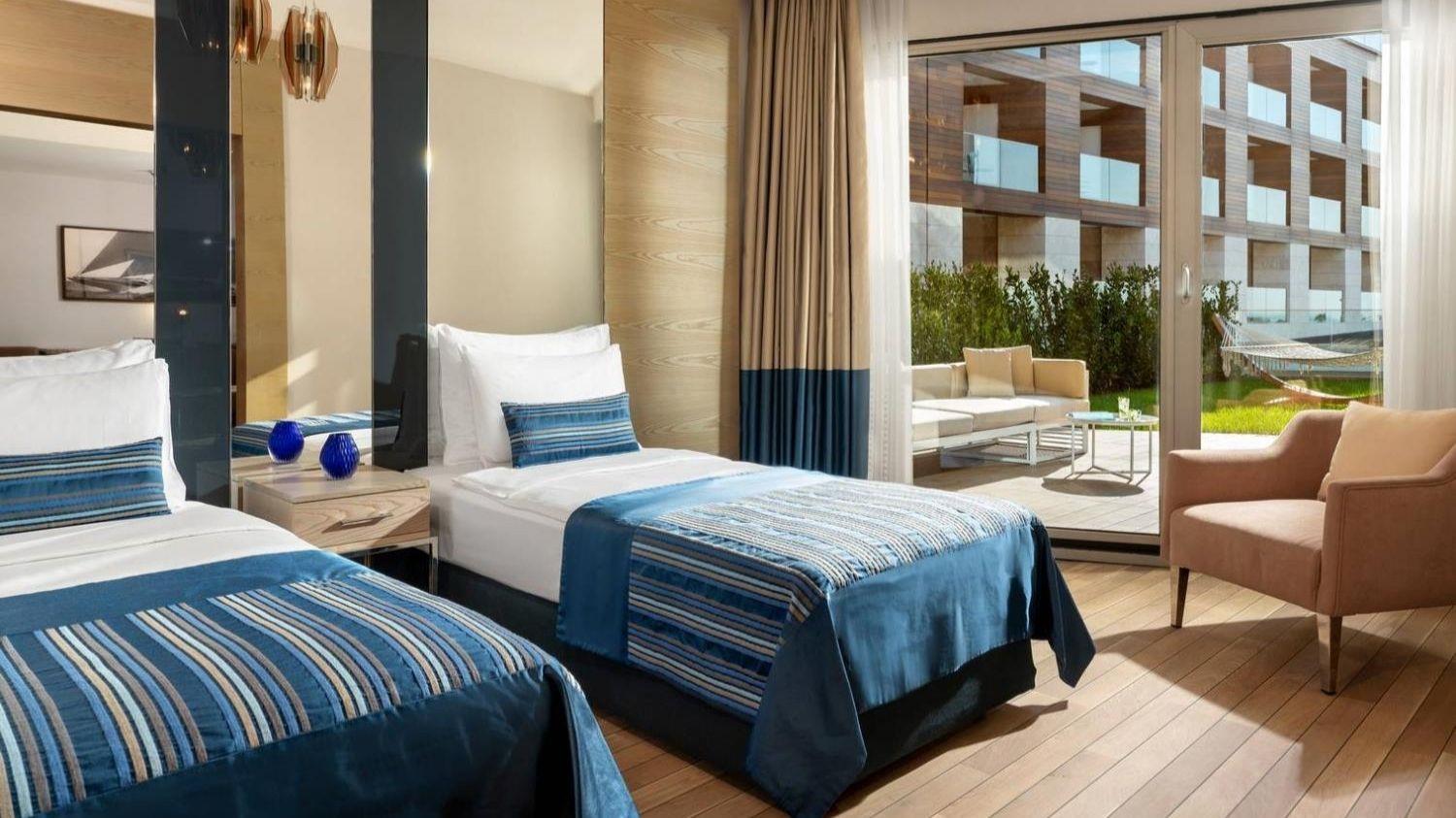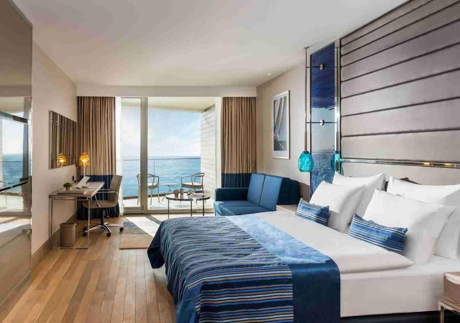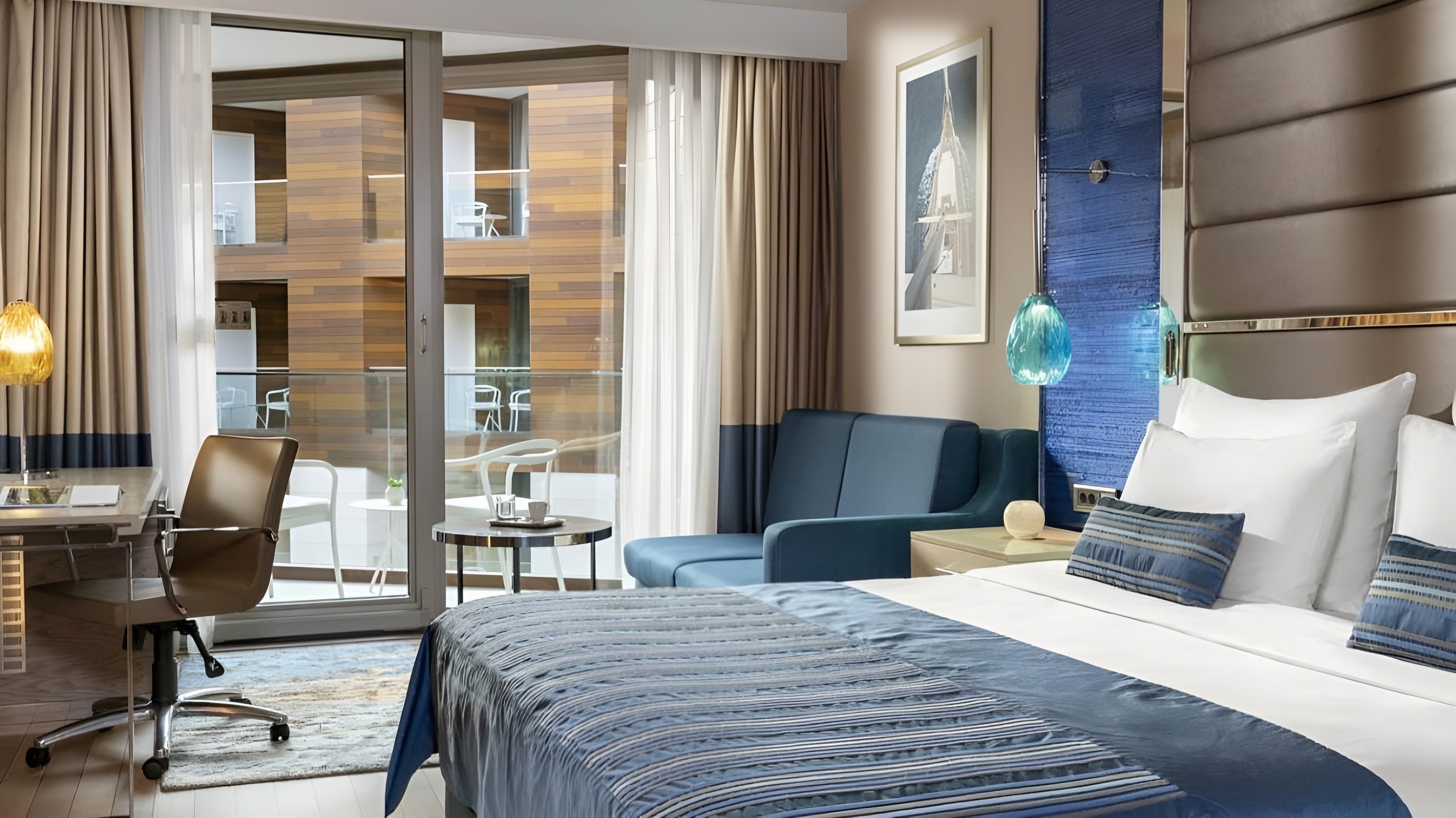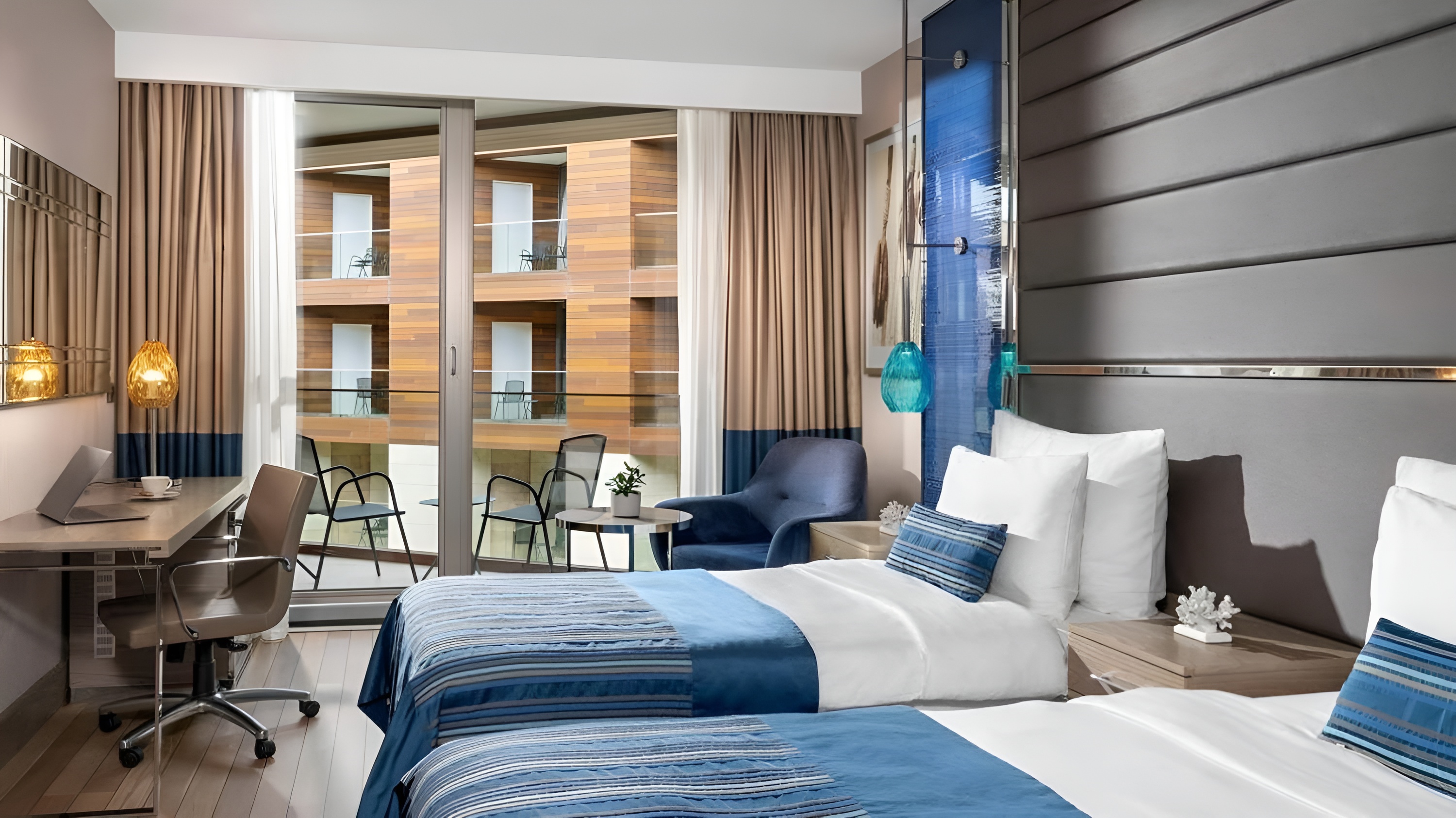 Комфортабельный номер с балконом, видом на море и собственной ванной комнатой с ванной/душем. Из удобств телевизор, кондиционер, сейф, чайные и гладильные принадлежности, Wi-Fi, фен. Гости размещаются на двух раздельных кроватях или одной двуспальной кровати и диване.
