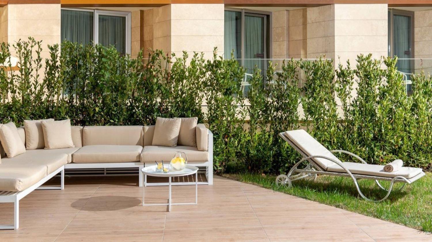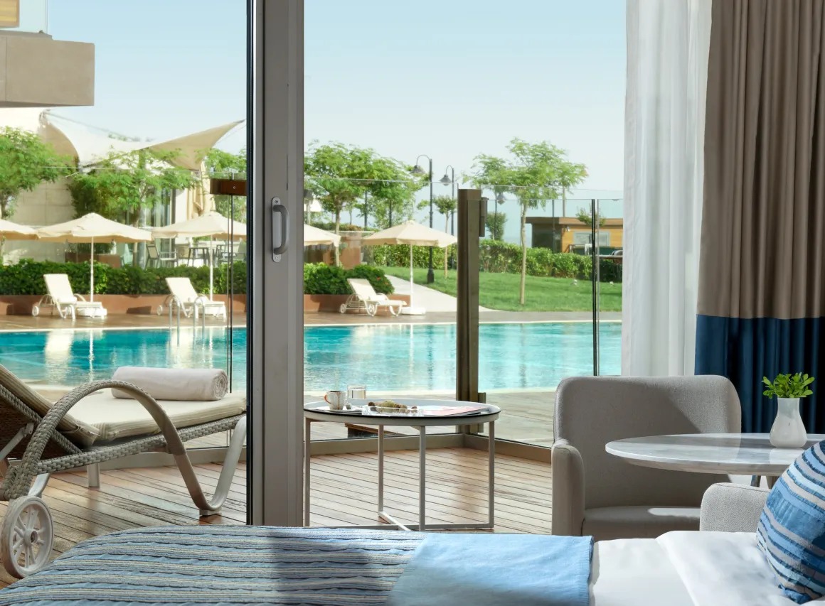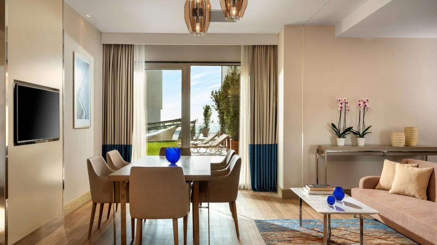 Номер представлен в двух вариантах: однокомнатный и двухкомнатный. В комплектацию входят двуспальная кровать, диван, телевизор, кондиционер, сейф, чайник, утюг, гладильная доска и фен. Собственная ванная комната с душем или ванной и банными принадлежностями. Номер с террасой и прямым доступом к бассейну.
